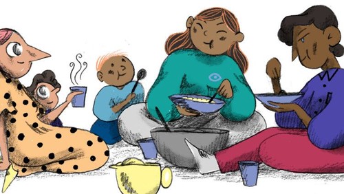Efter gudstjenesten spiser vi aftensmad sammen i Klostersalen i tilknytning til kirken. Maden er børnevenlig og står klar på langbordene, når gudstjenesten er slut. Her er der mulighed for både at møde nye mennesker og have tid til at være sammen med andre fra mødre- gruppen, børnehaven, vuggestuen eller hvor I kender hinanden fra i forvejen. Det hele slutter senest kl. 19.30, så de mindste kan være hjemme til sengetid.